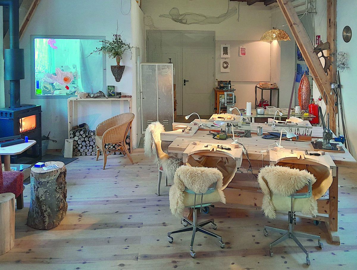 Alexandra Kusch teilt sich die Werkstatt mit ihrem Lebensgefährten Michael Löhrmann, der dort jedoch kein Edelmetall verarbeitet, sondern Holz. Auch bei ihm gibt es ein abwechslungsreiches Workshopprogramm von Grundkenntnis- bis zu Spezial-Kursen.