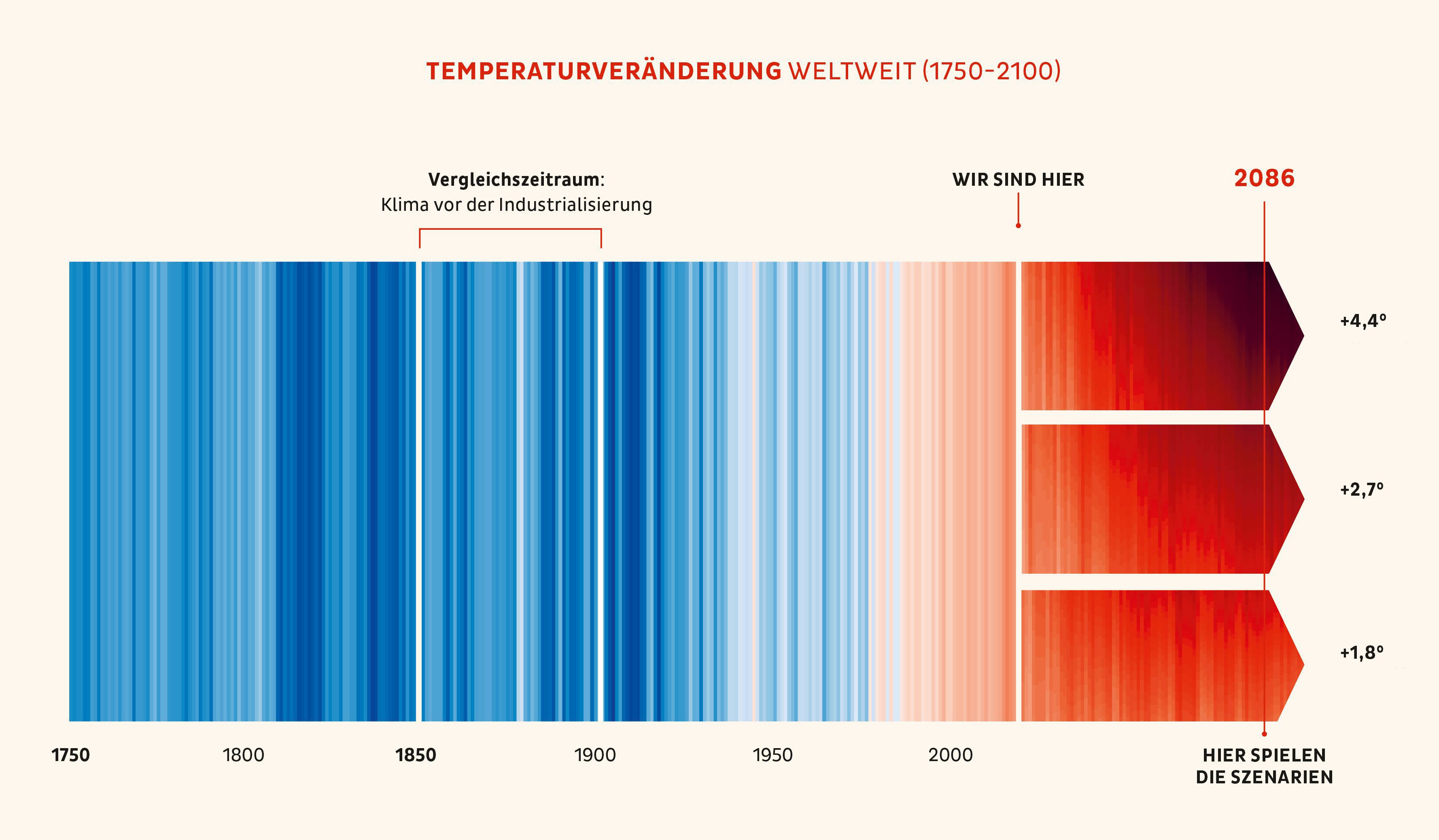 Welchen Unterschied jedes einzelne Grad macht, erzählen drei Geschichten: Lesen Sie, wie wir im Jahr 2086 leben werden – je nachdem, ob die Erde um plus 1,8 Grad, um 2,7 Grad oder um 4,4 Grad wärmer geworden ist.
