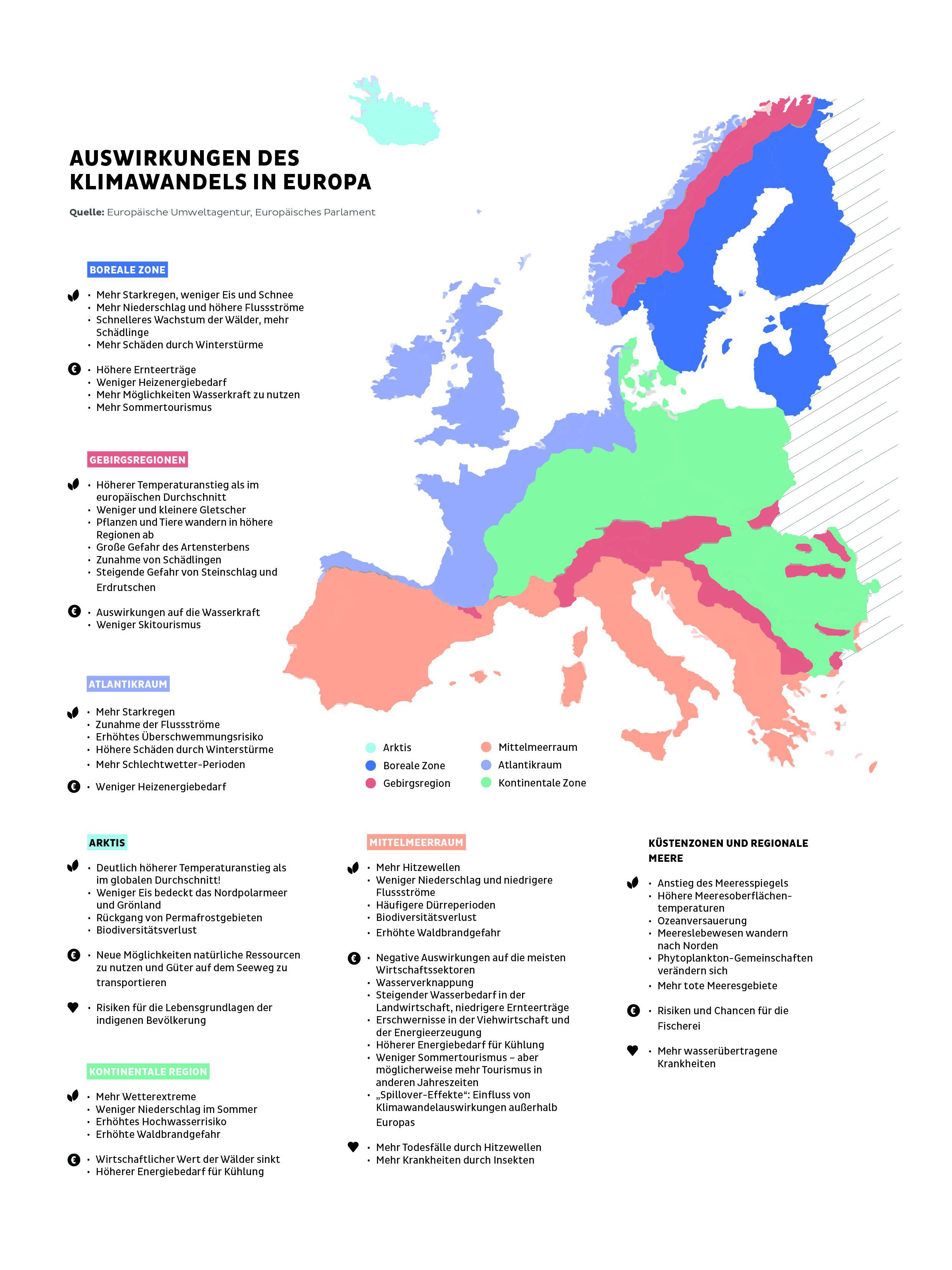 Auswirkungen des Klimawandels in Europa Datum 21.06.2023 Ressort Klima, Natur Karte als PDF herunterladen oder durch Klick aufs Bild vergrößern: Quelle: Europäische Umweltagentur, Europäisches Parlament