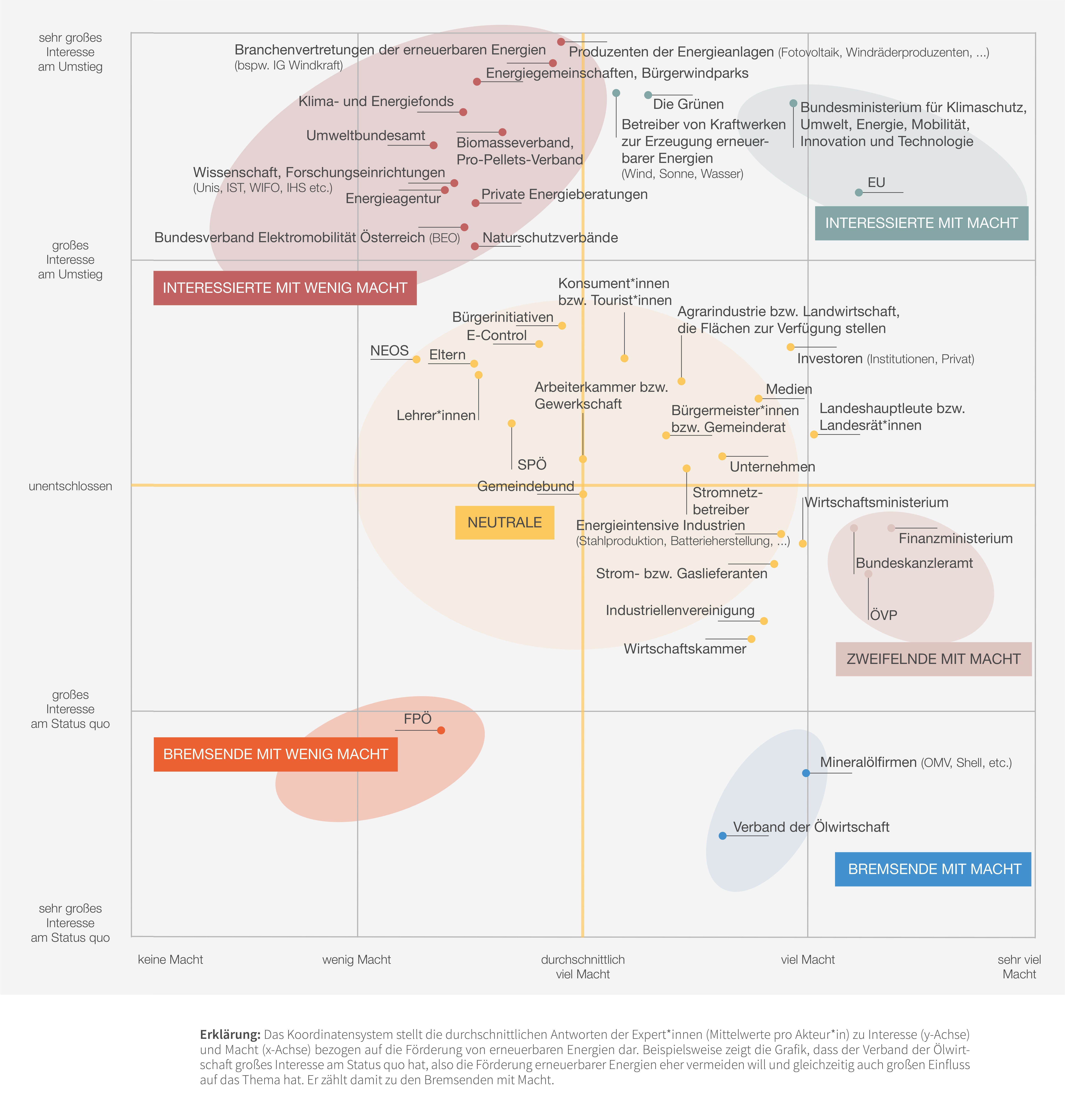 Als Barrieren für den Klimaschutz werden von Expert*innen und Bevölkerung unter anderem das Intervenieren von Lobbyisten und fehlender politischer Wille attestiert. Beide Gruppen sind allerdings der Meinung, dass die Wirtschaft durchaus Interesse am Umstieg auf erneuerbare Energien zeigt. Interessierte Akteure mit Macht, etwa das Bundesministerium für Klimaschutz oder die Europäische Union müssen allerdings nicht nur umsetzen, sondern auch überzeugen. Klassische Maßnahmen wie strengere Gesetze um „Bremsende mit Macht“, etwa Ölkonzerne, zu bewegen, können erst umgesetzt werden, wenn die Mächtigsten, die aktuell noch zweifeln, überzeugt werden.