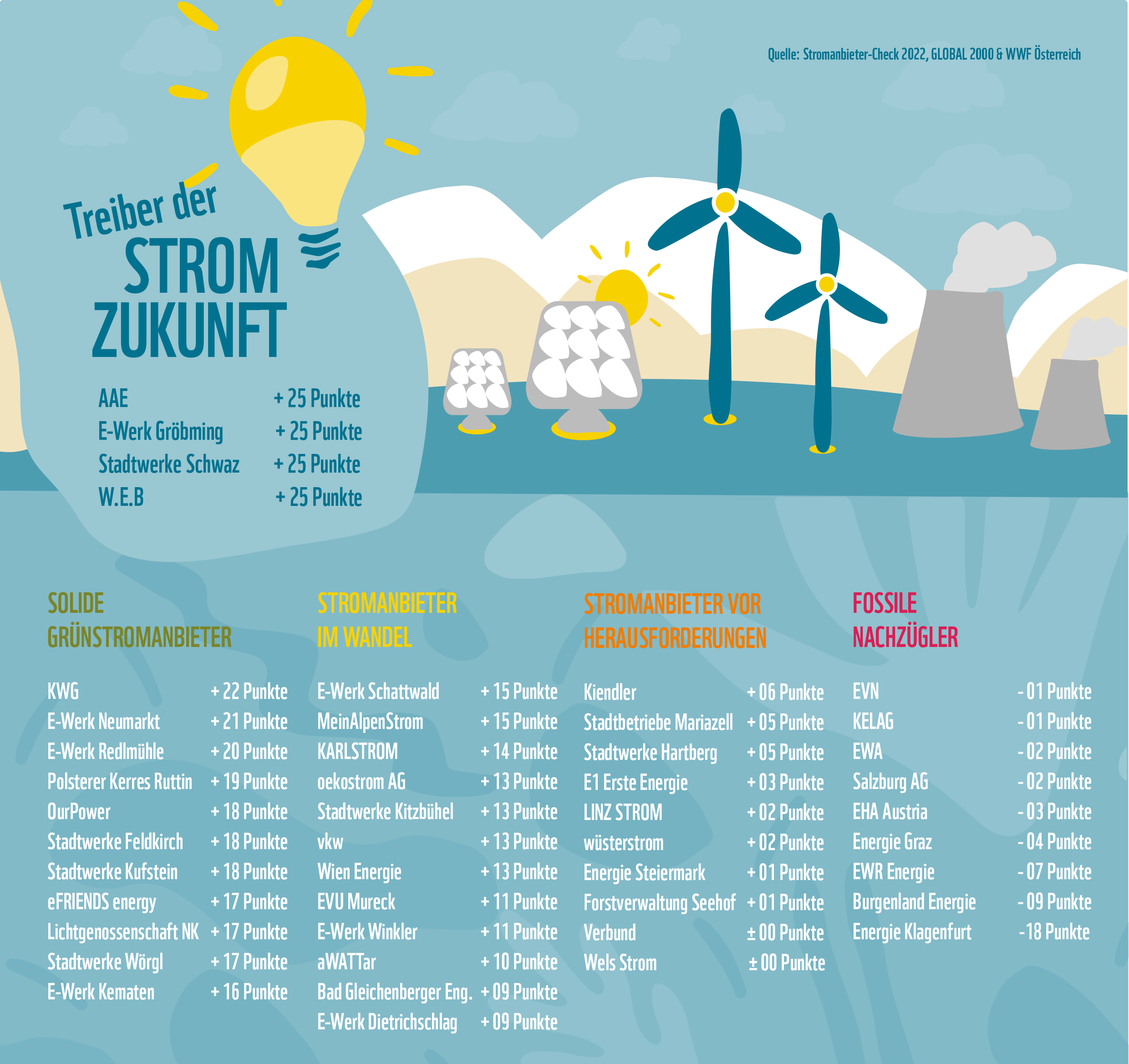 Der Stromanbieter-Check 2022 ist eine Bestandsaufnahme der österreichischen Anbieter auf dem Weg in eine klimafitte Zukunft. Die Studie soll als Information und Grundlage für Kund*innen dienen, von ihrem Anbieter eine krisensichere Neuausrichtung und einen Ausstiegs-Plan aus fossilen Energien zu verlangen. „Wir rufen alle Stromanbieter auf, zu ‘Treibern der Stromzukunft’ in Österreich zu werden. Nur so schaffen wir die Strom-Wende bis 2030, wie sie von der Bundesregierung angestrebt ist und wie es angesichts der Klimakrise notwendig ist”, sagen die Klimasprecher von GLOBAL 2000 und WWF Österreich.